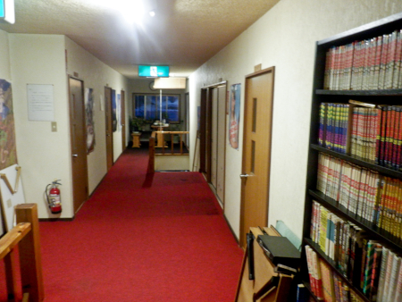 客室が並ぶ岡村旅館の二階の廊下。前方の階段脇の左の角部屋が案内された部屋ですが、廊下には漫画本がぎっしり詰まった本棚が置かれています。
