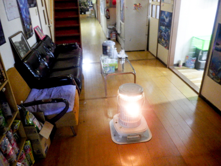こちらは一階の廊下。寒いので灯油ストーブが灯けられていましたが、一階には浴場と洗面所、トイレ、厨房などがあります。なお、浴場入口脇のソファの前には湯上りに飲み放題の冷たいお茶のポットが置かれています。
