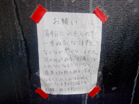 湯船に水を入れて一度ぬるくなりますとなかなか熱くなりません。 次の方がぬるいお湯にしか入れなくなるだけでなく 温泉の効能も弱まります。 なるべく水入れはお控えくださいますようご協力をお願い致します。 |