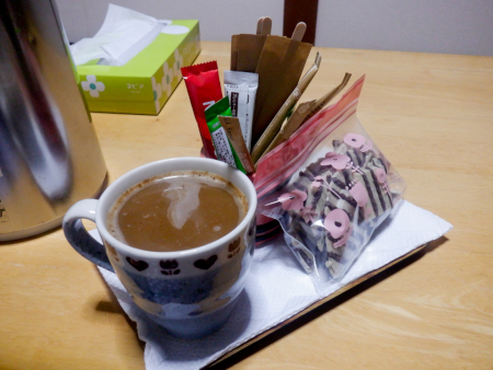 部屋にはスティックタイプのコーヒーが用意されているので、夕食まで熱いコーヒーで寛ぎます。お茶請けには八戸や岩手県北で良く食べられている南部せんべいにチョコレートがかかった「チョコQ助」が! 東北以外の地域ではほとんど知られていませんが、チョコQ助って、南部せんべいの塩味とチョコレートの絶妙な組み合わせでかなり人気のお菓子なんだよな〜。 |