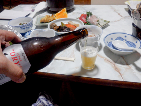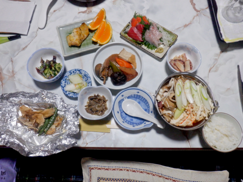 夕食は廊下を挟んだ向かいの小部屋でいただきます。部屋で寛いでいると、一階の厨房から階段を登り下りして料理を運ぶ女将さんの足音が忙しなくなってきて、やがて「夕食ができました〜」との呼び声がかかりました。 さっそく暖かいどてらを羽織って小部屋に移動しますが、おお、いつもながらに質、量ともに言うことなしの素晴らしい料理の数々が並んでいるな! というわけで岡村旅館のこの日の献立は以下の通り。 お刺身三種盛り(マグロ・サーモン・クロソイ)・バイ貝と野菜と厚揚げの煮物 白身魚の西京焼きオレンジ添え・干し鱈ときゅうりの酢の物 ホタテとキノコとオクラのホイル焼き・酢ダコ(ミズダコ) キムチ鍋チックな鱈の寄せ鍋・さもだし(ナラタケ?)・おしんこ・白いごはん |