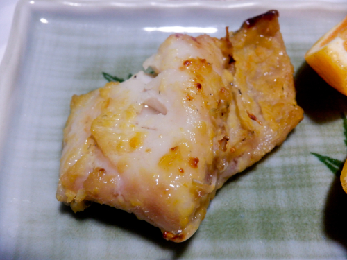 白身魚の西京焼きです。魚の種類は失念しましたが、香ばしい香りとコクの西京焼きは酒の肴によし、白いごはんのおかずによしとまさに最強。魚の旨味と西京味噌の風味が相まって、これがあれば白いごはんが無限にイケちゃいますなぁ!
