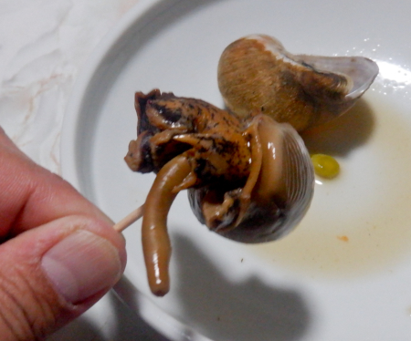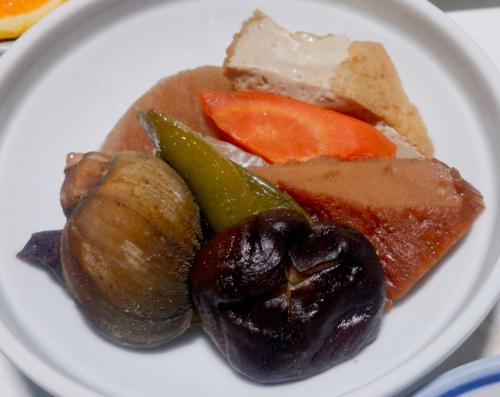 味がじゅわ〜っと染み込んだ煮物です。具材は厚揚げに大根、ニンジン、インゲン、シイタケにさつま揚げですが、注目すべきは殻ごと煮込んだ「モスソガイ」。 モスソガイはいわゆるバイガイの仲間。関東ではあまり馴染みがありませんが、青森県では市場でよく見かけ、特に陸奥湾産のものは高価なのだそうです。そんなモスソガイの旬は晩秋から冬にかけてで、煮物として煮つけたり、おでんの種にしたり、また、正月には煮染めに入れられたりするそうですよ。 |