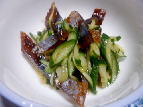 おお、こいつは「干し鱈」を使った酢の物じゃないですか! 九艘泊で見かけてぜひ食べたいと思っていた干し鱈ですが、まさか当日の夕食で出されるなんて、なんというタイミングの良さでしょう! キュウリの水分と鱈から滲み出た旨味が絶妙な出汁となって、さっぱりとしてマジ美味かったです。