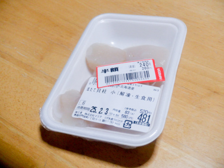 そして気になるお値段ですが、なんとこれで260円! 実は旧川内町エリアで唯一のスーパー「マエダストア」で481円が半額セールで売られていたのを見かけたのを買っておいたんだよな。ただし、ラベルをようく眺めると、産地は陸奥湾ではなくて北海道。でもまあ、それは見なかったということで・・・。